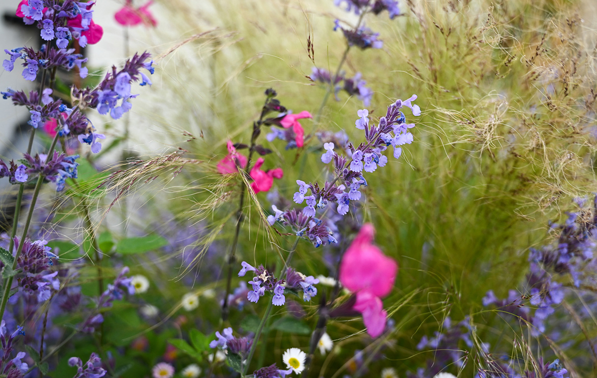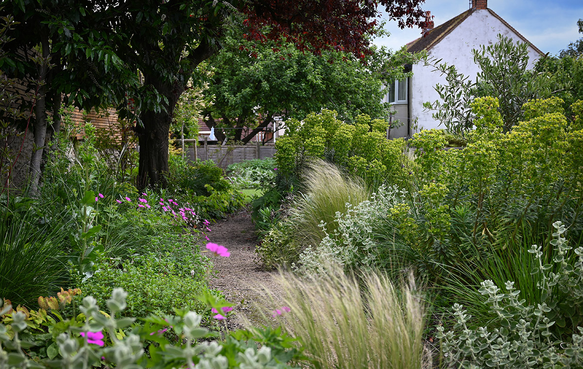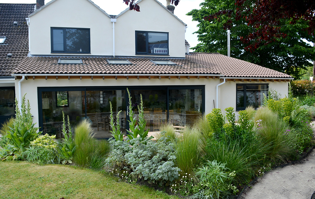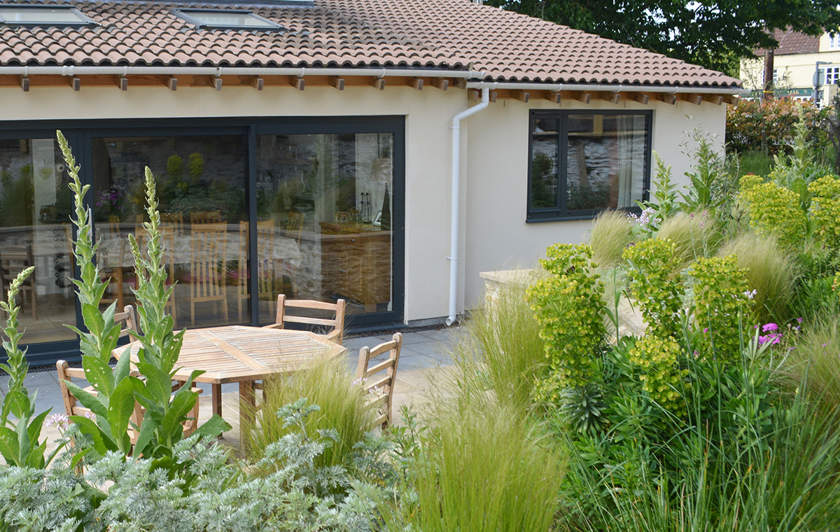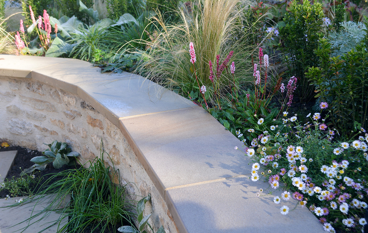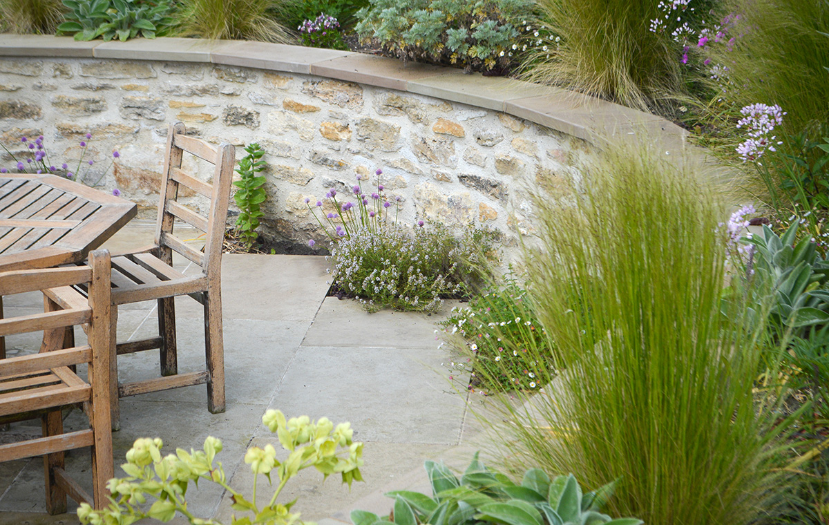 Walls were crafted using local limestone and were paired with limestone paving. Planting softens and lightly defines the different levels and spaces. Plants including trailing rosemary will soon start to tumble over the walls.
