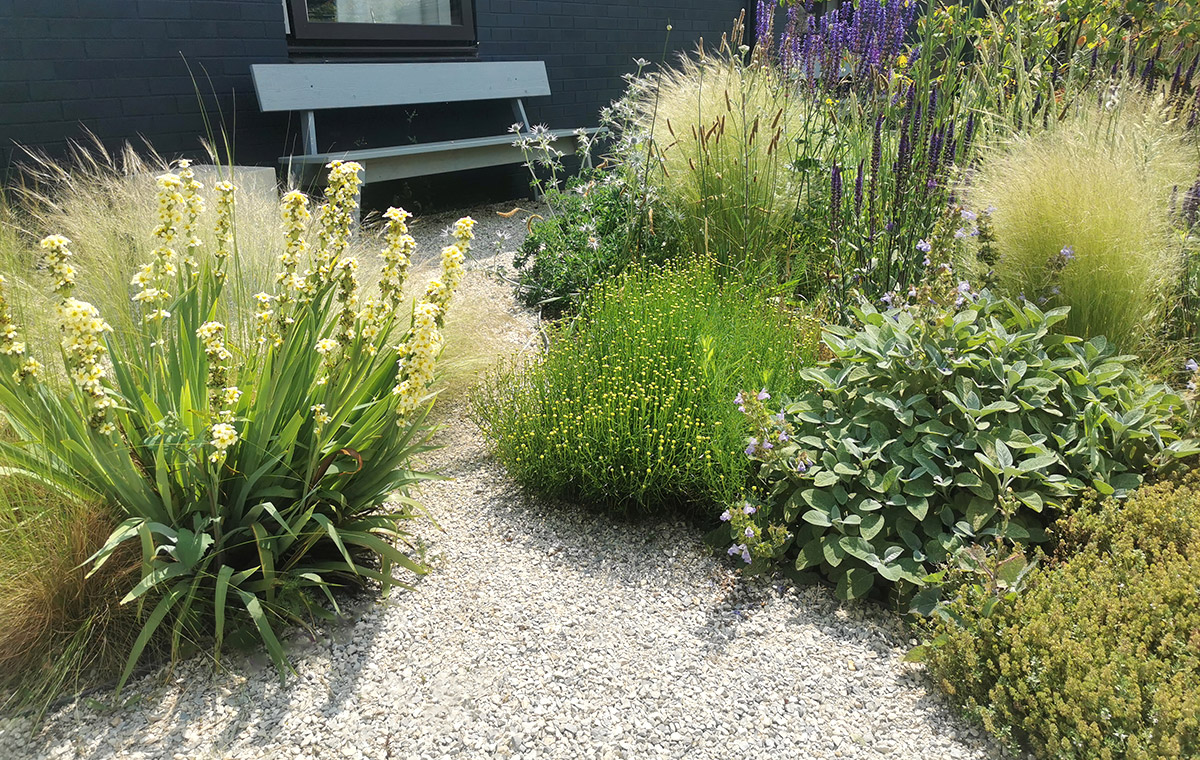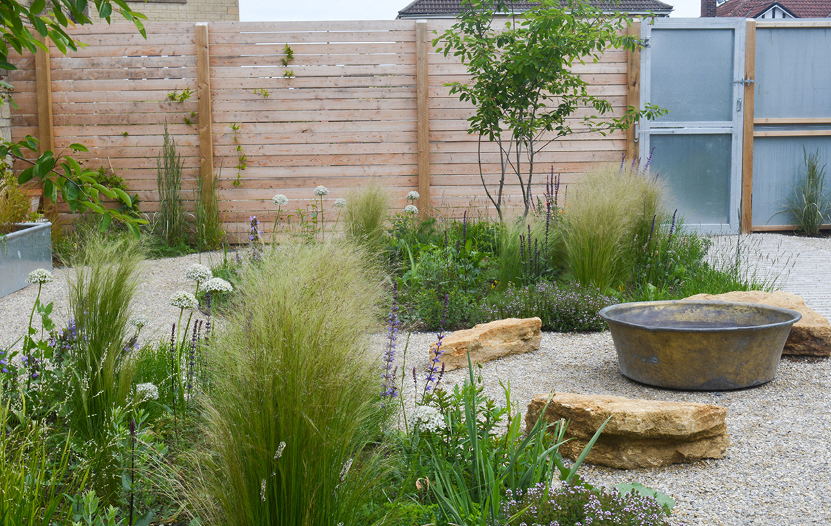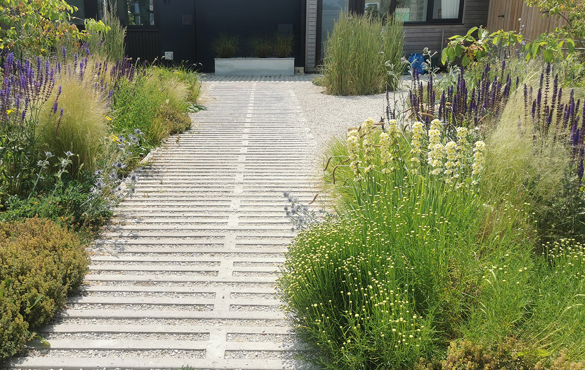 A contemporary driveway and inner front courtyard garden with an industrial twist, juxtapose with plenty of soft, natural style planting. A bespoke fence and gate divide the driveway and inner courtyard, as well as creating privacy and screening from vehicles and the road beyond.