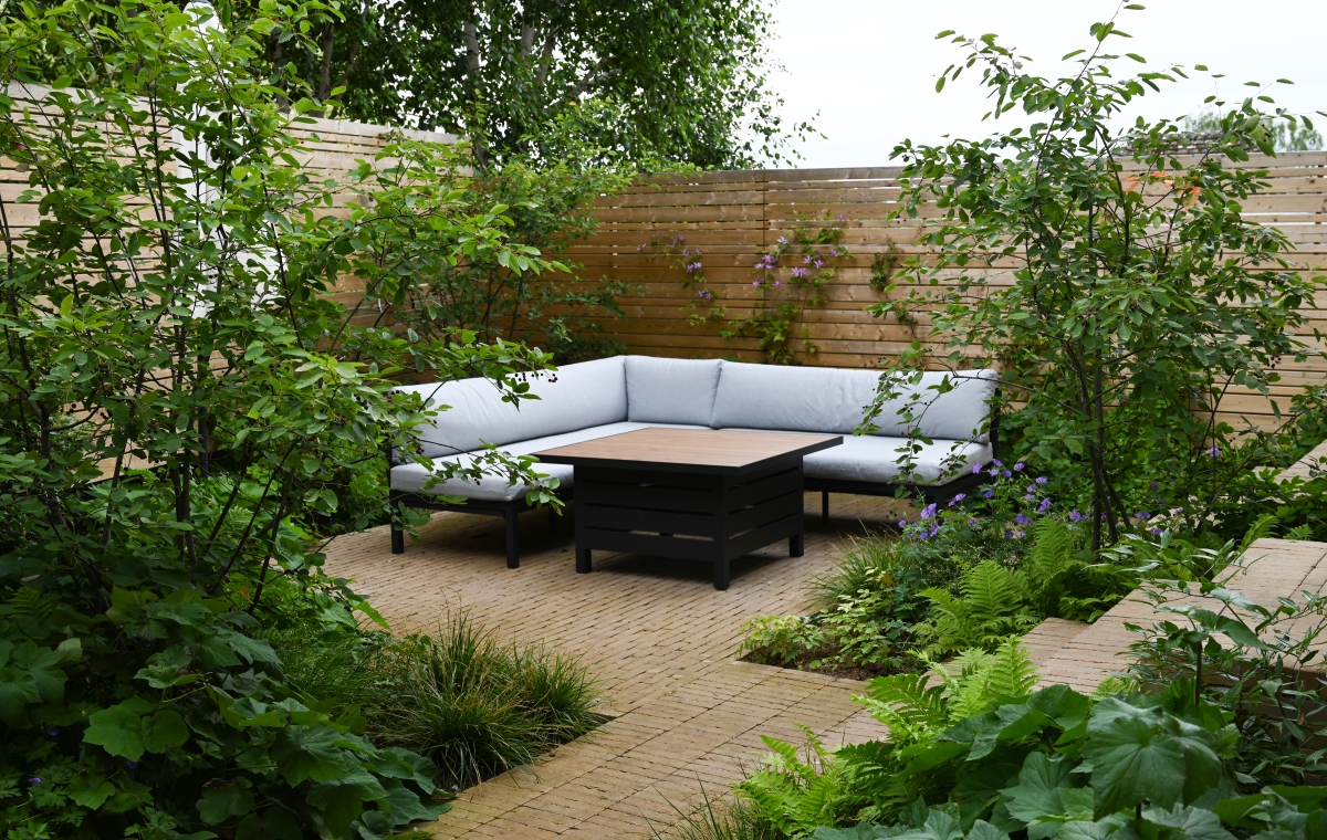 This pocket-sized corner garden has been transformed from an uninspiring, damp plot into a light and airy contemporary space with generous seating areas surrounded by greens with pops of colour.