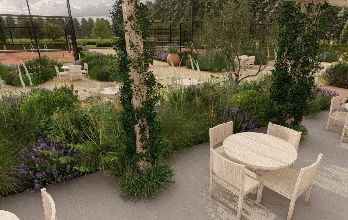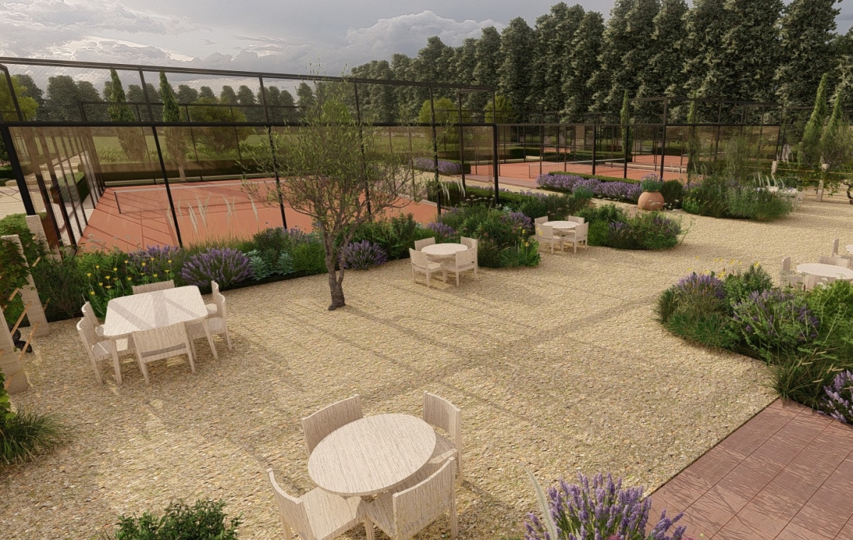 The courts & eatery are set within Mediterranean - English style gardens, with a wider setting of wildflowers, mowed paths, native trees and orchard. Reclaimed terracotta, local gravels and timber will form the paths, meeting and dining spaces.
