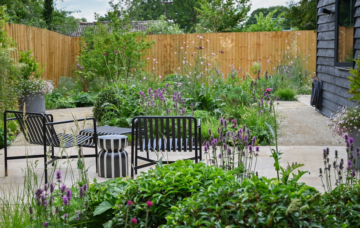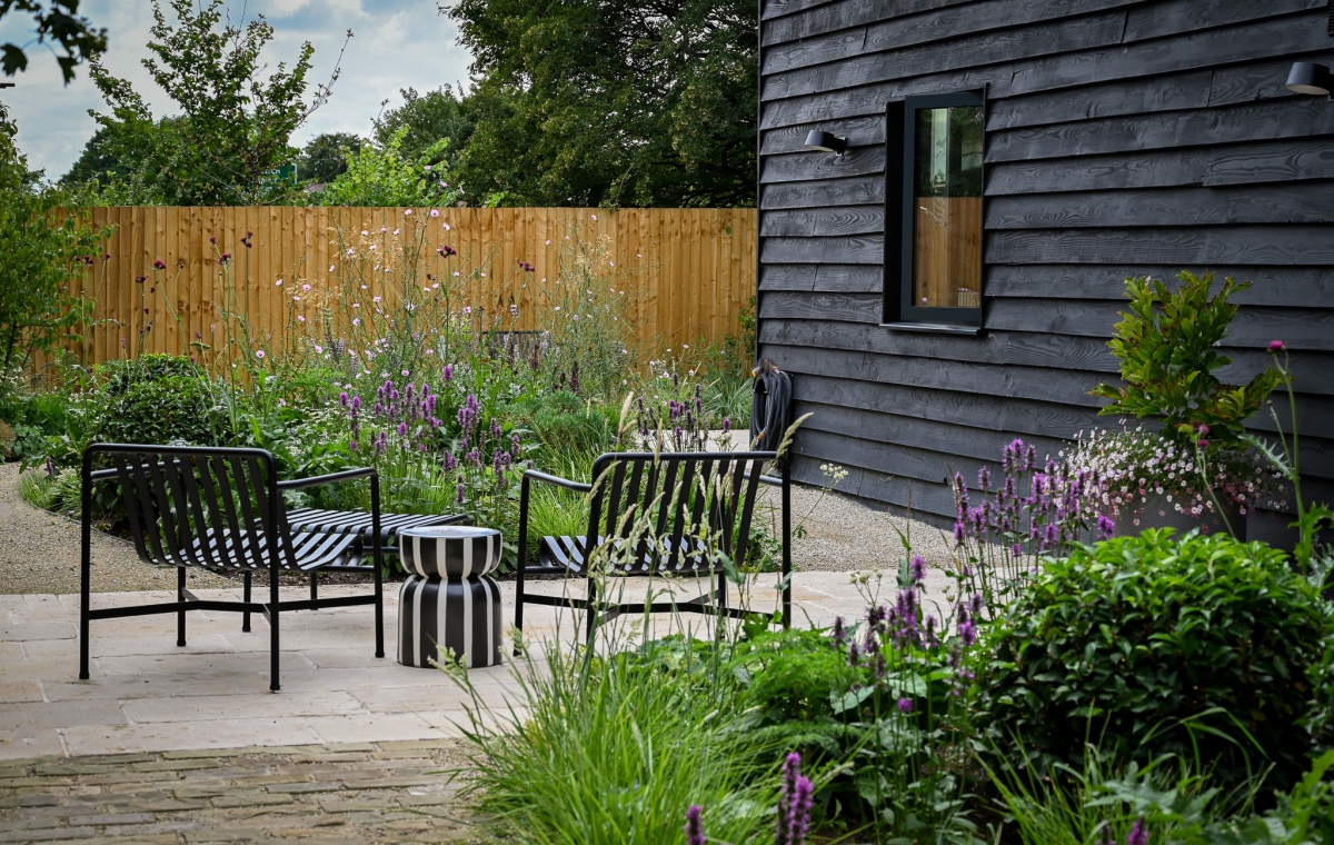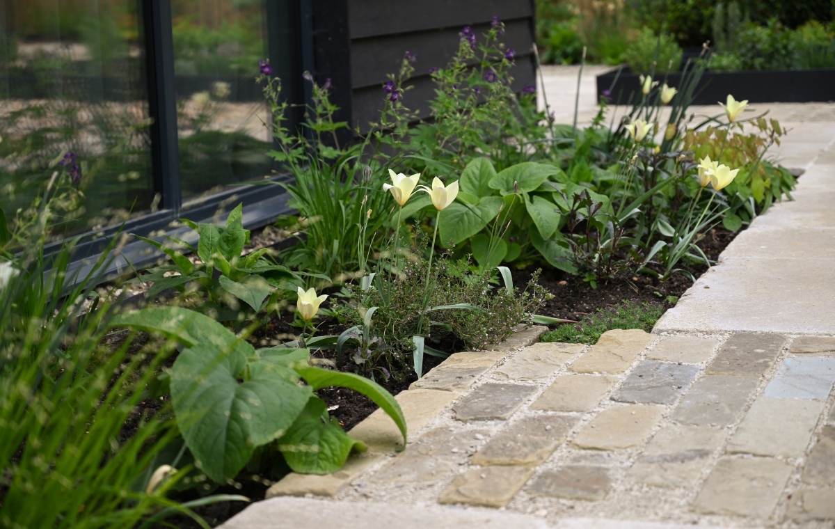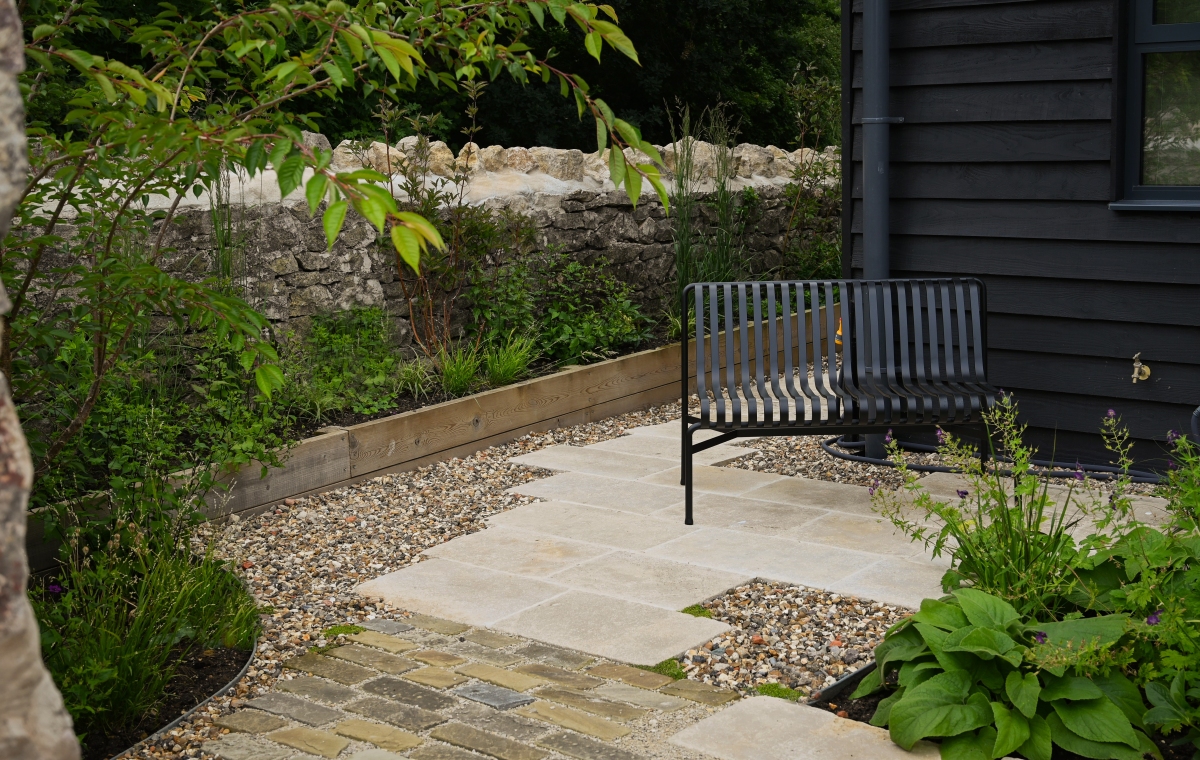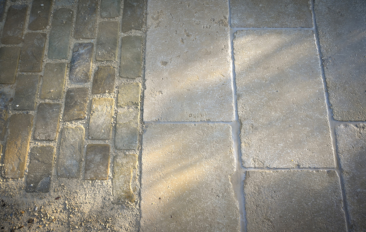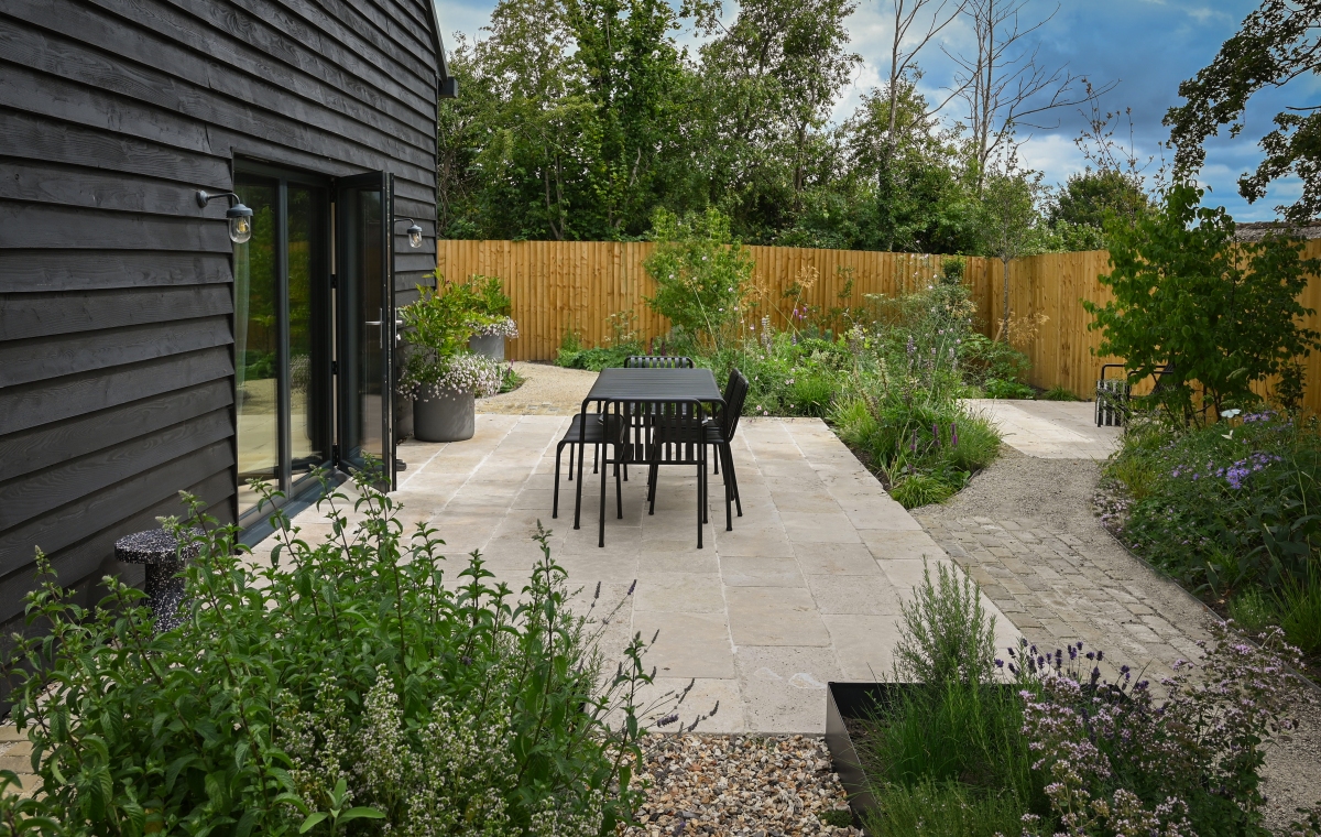 The natural limestone, York cobble and Hay furniture blends with the style of the house.