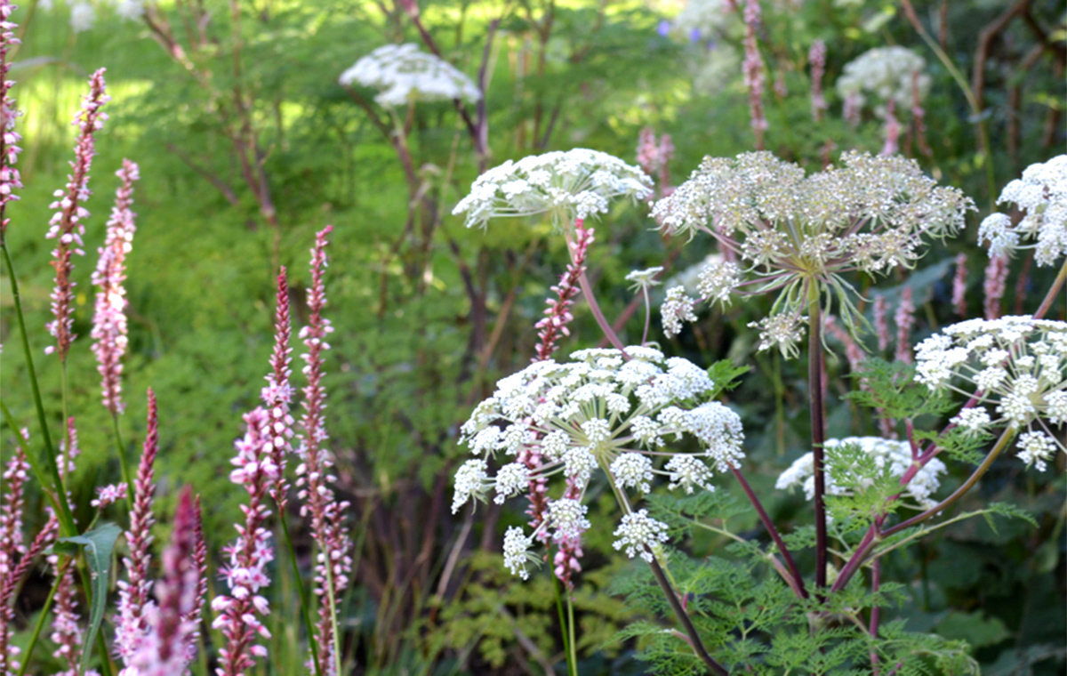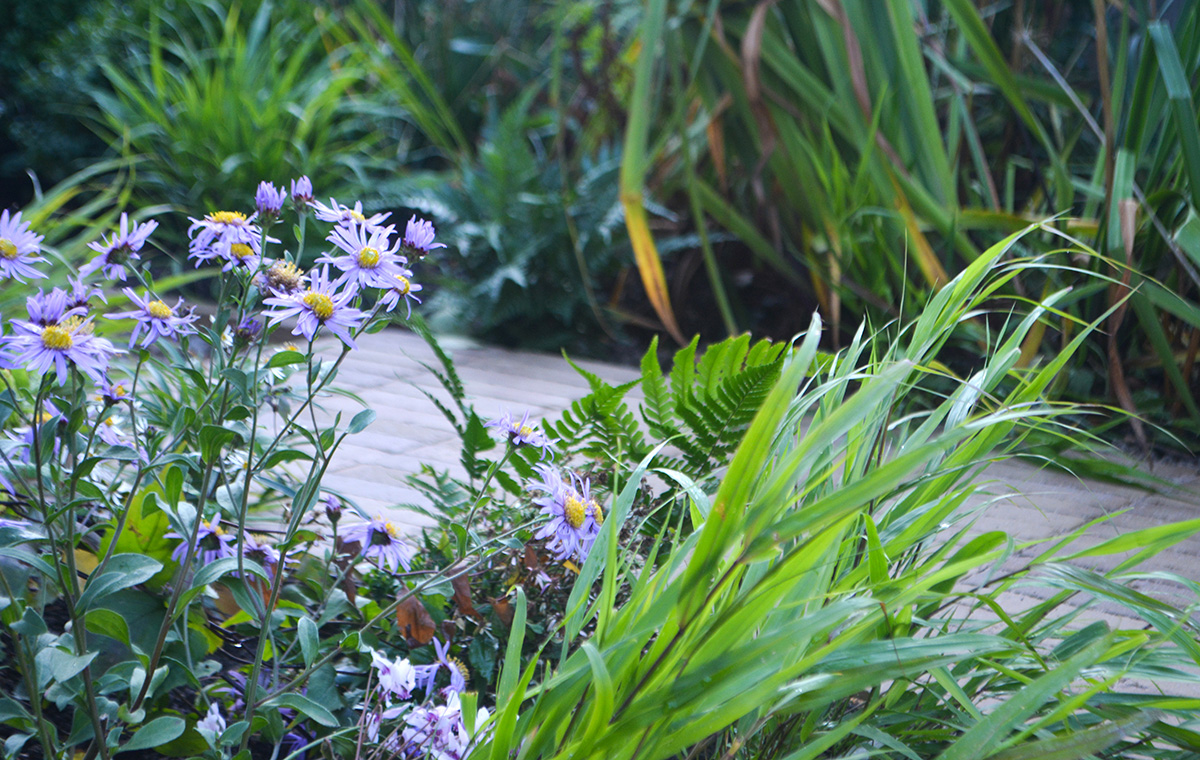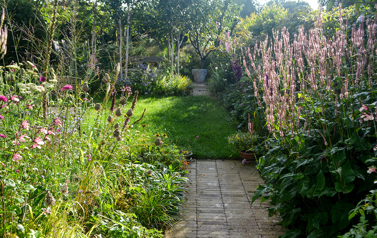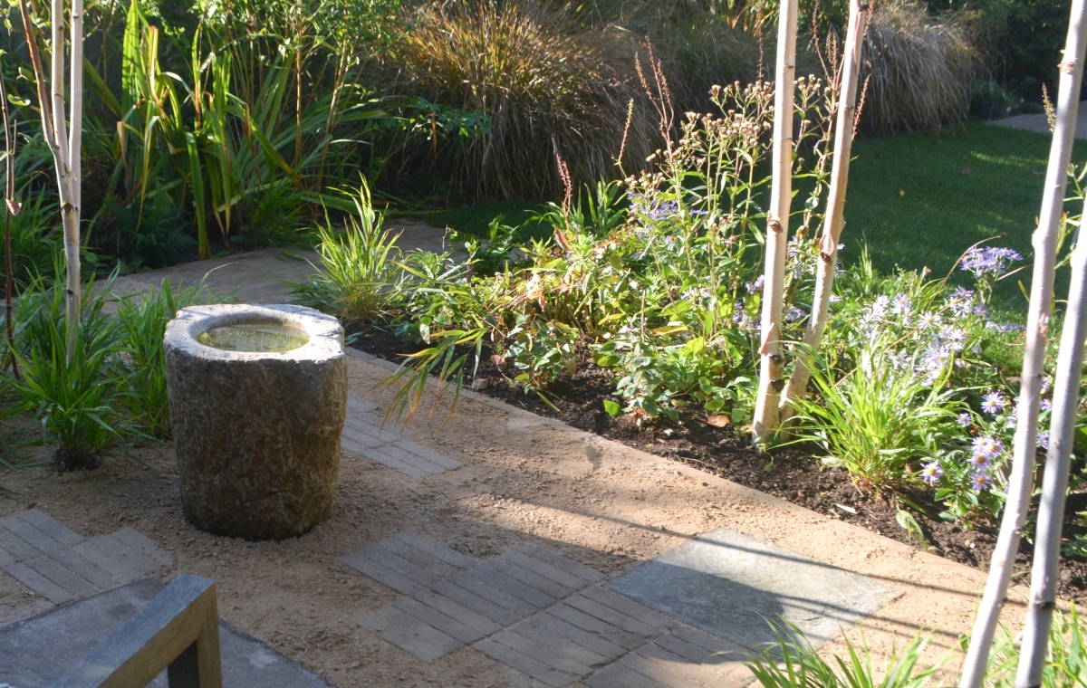 Dining and relaxing spaces are nestled within planting, creating intimate areas, whilst still retaining an open feel overall. A still water bowl, lush woodland planting and mixed reclaimed and clay pavers create an informal and inviting space for relaxing and socialising, with space for a firepit for cosy evenings around a fire.