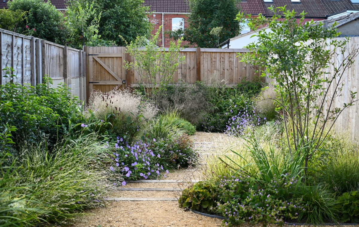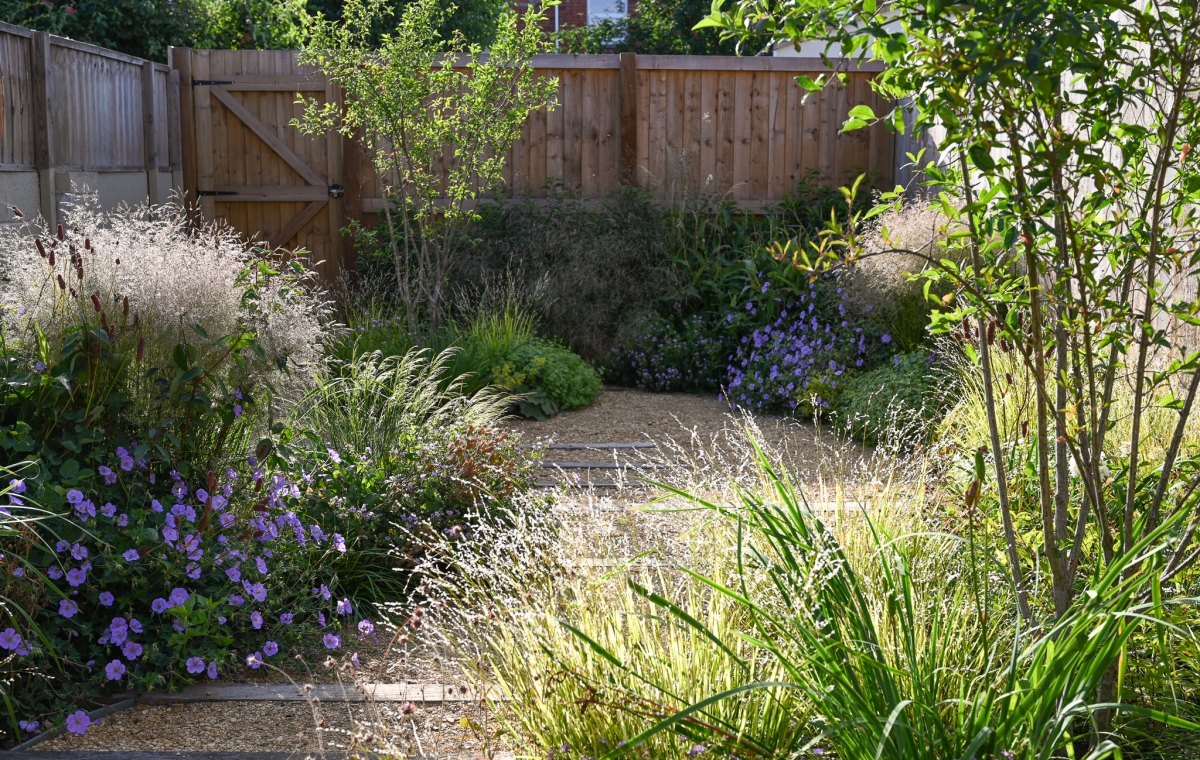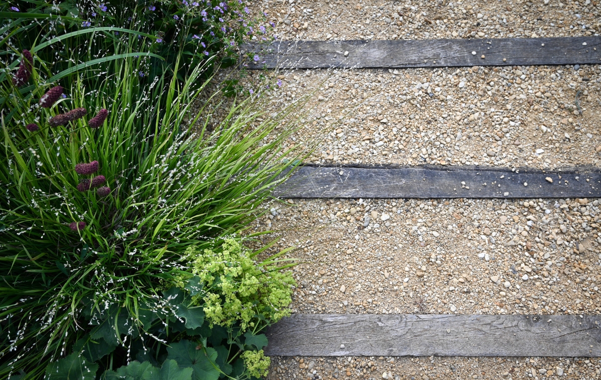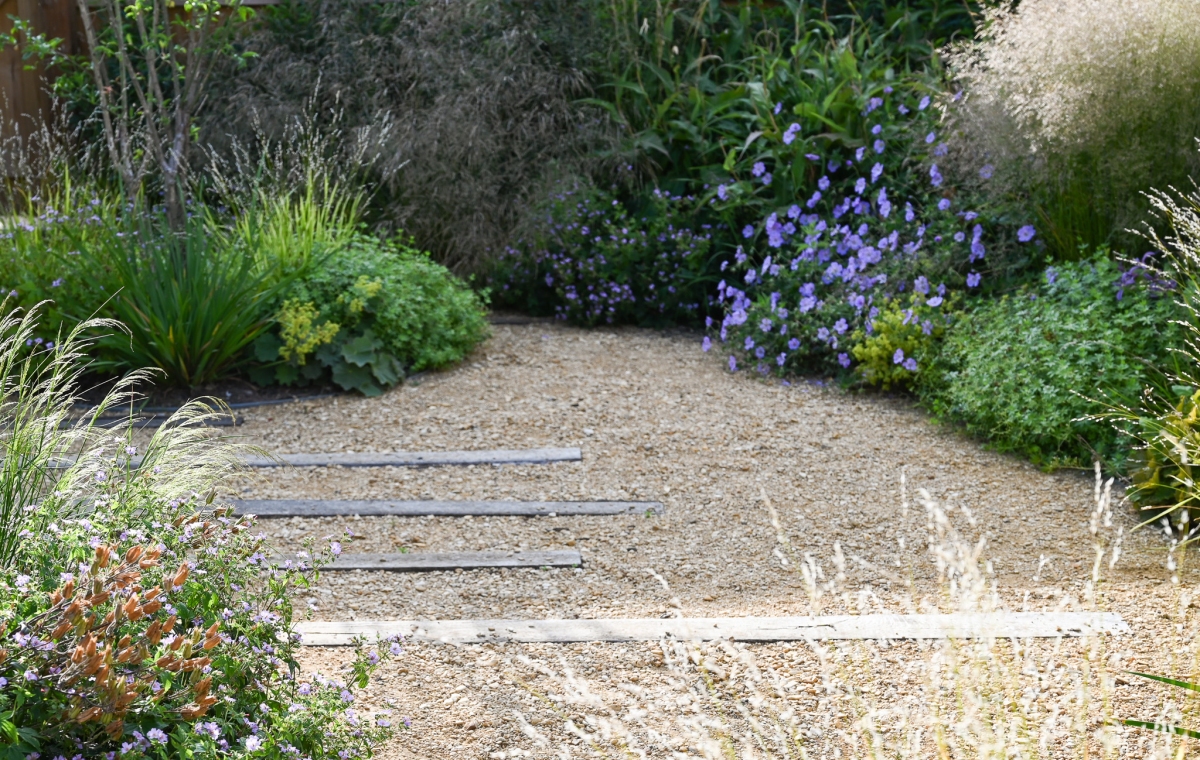 Simple materials with oak sleepers set into gravel and an abundance of planting.