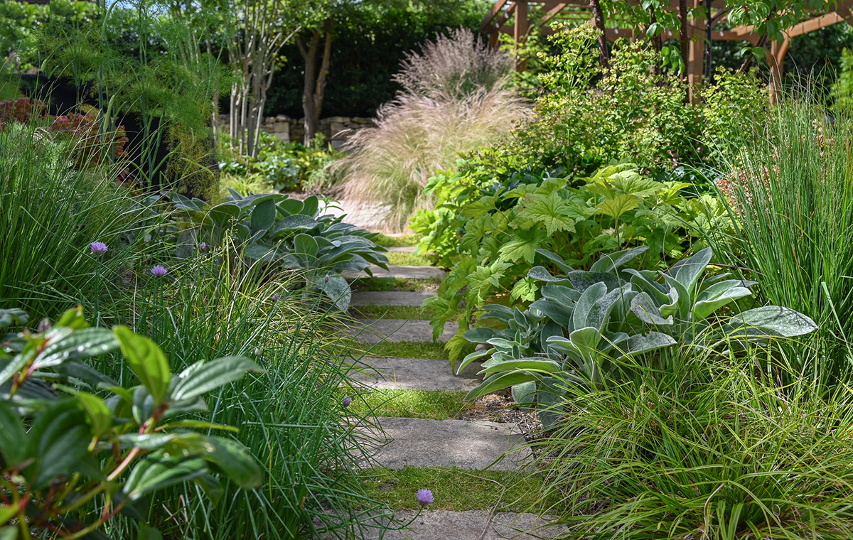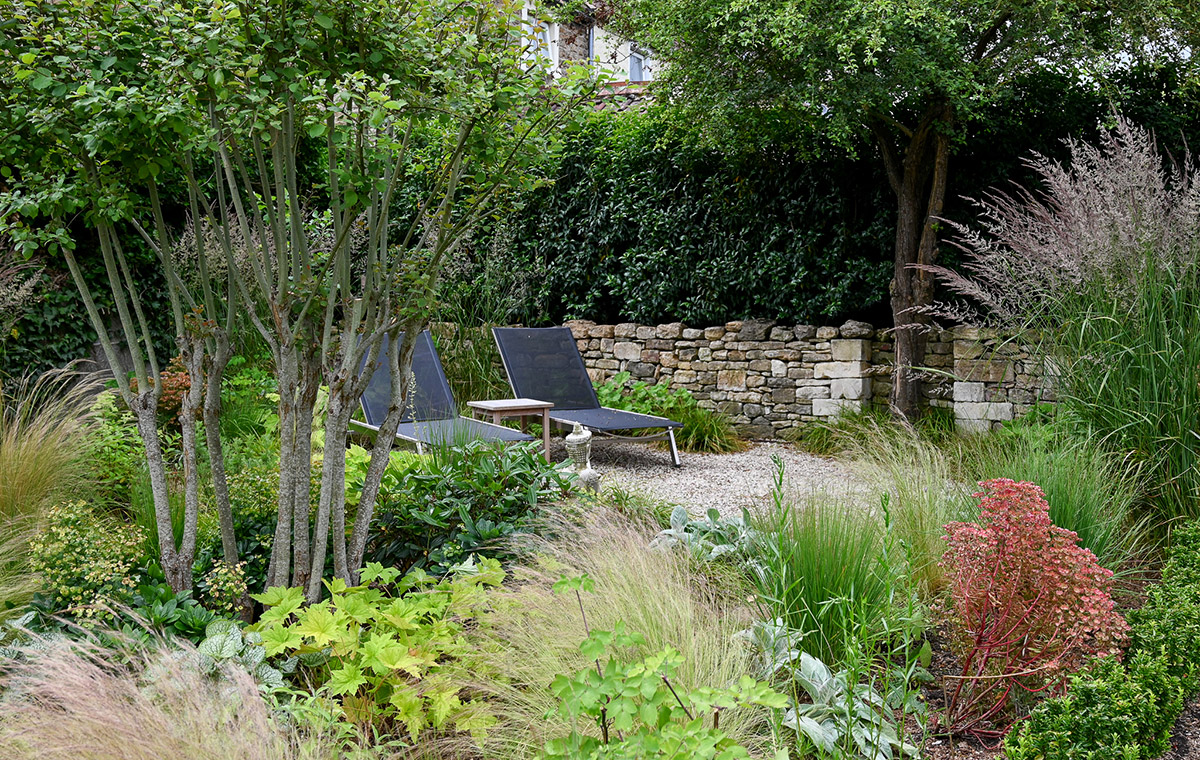 The spaces are connected with reclaimed stepping stones and paths. Planting gently screens and surrounds the spaces, creating an immersive quality.