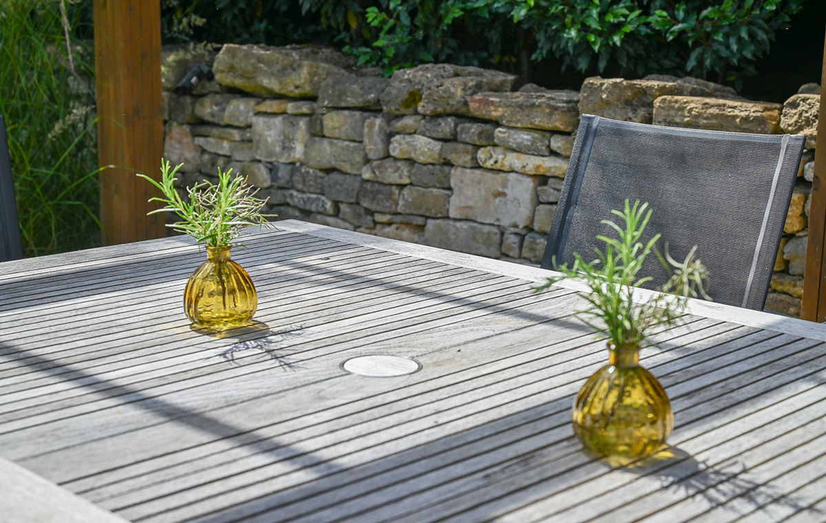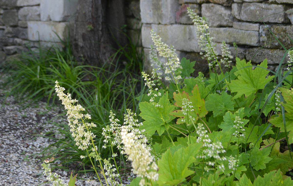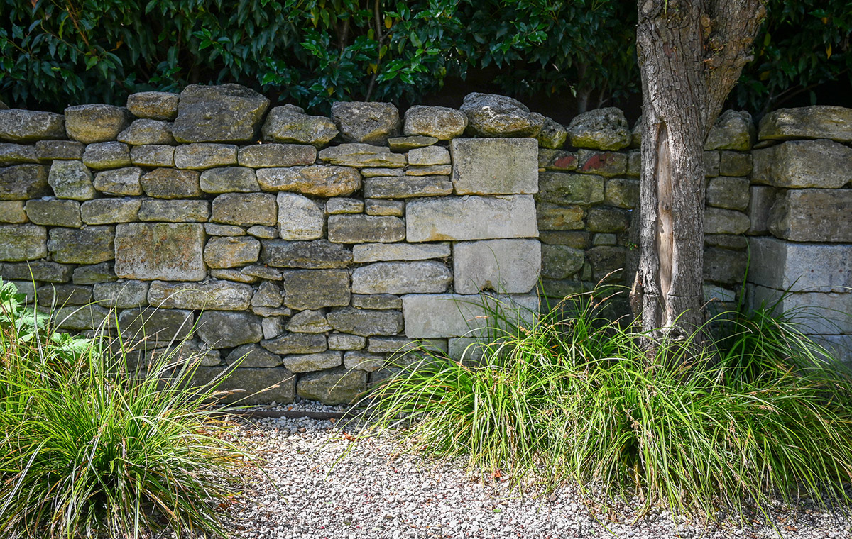 The limestone paving blends with the surrounding character and the reclaimed dry-stone walling. Planting is textural, green and lush.